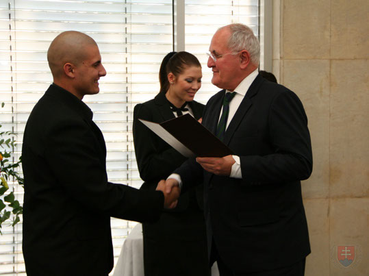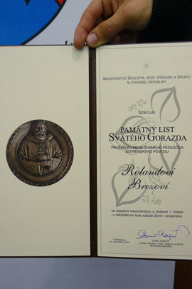 14. novembra 2012 v bratislavskom hoteli Bôrik minister školstva, vedy, výskumu a športu Slovenskej republiky Dušan Čaplovič ocenil žiakov a študentov za úspechy v medzinárodných predmetových olympiádach a športových súťažiach. Pri príležitosti Medzinárodného dňa študentstva si prevzalo z rúk ministra Pamätné listy sv. Gorazda 72 žiakov z celého Slovenska. Medzi ocenenými je aj náš študent Roland Brezo za úspešnú reprezentáciu a získanie 1. miesta v celoštátnom kole súťaže Zenit v strojárstve. Srdečne blahoželáme!